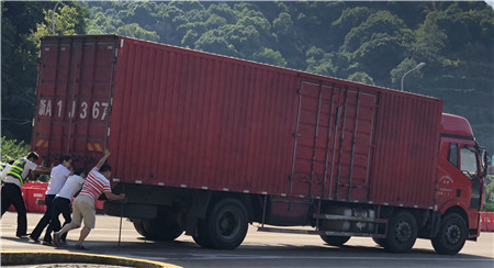 6月19日15時左右,一輛杭州牌照的大貨車,在進入臨海南收費所三車道時突然熄火拋錨,司機嘗試了幾次無法啟動,立刻下車檢查車況。 “師傅,怎么了?有什么能幫您?”收費員徐海源見此情景,立即上前熱心詢問。 “哎!包在油箱口的塑料紙怎么就掉進油箱內,現在車子怎么都發不動不了。”司機有點發急地回答。 “師傅,別著急,我先找幾個同事幫您把車推出車道。”收費員趕緊安慰司機焦急心情。 “好的,那謝謝你們。”司機連忙點著頭。為了避免車道堵車,徐海源立刻利用對講機向當班班長周萍說明情況,周萍立刻關閉該車道,啟動備用車道。此時此刻,收費員李俊杰、楊旭佳毫不猶豫的趕了過來與駕駛員一起推動車子。“一、二、三,一、二、三,使勁呀……”可是車子仍然紋絲不動。怎么辦?請求支援!正準備下班的行政人員陳瑩、劉華萍得知情況后,二話不說飛奔到車道,加入到推車行列中。用力推呀——哎,不行;再來一次——還不行。面對23.97噸的大貨車,大家仍是束手無策。“去找根鐵棒試試!有道是給你一根鐵棒,我能翹起整個地球。”不知是誰大喊了一聲。“行,可以試試,快去找”話音剛落李俊杰快步跑向所內,尋找鐵棒。不一會兒,只見他興奮地高舉鐵棒沖著大家喊道:“找到了!找到了!”