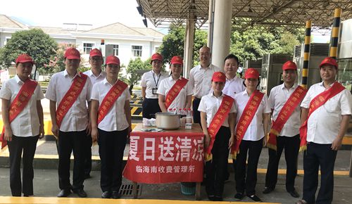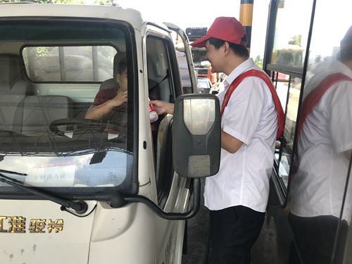 天氣雖炎熱,服務不“打烊”。 在活動中,志愿者們不顧自身大汗淋漓,仍身披橫幅,頭戴小紅帽,面帶微笑向途經收費所的司機們遞上一杯杯綠豆湯、一瓶瓶礦泉水。同時,大家還不忘宣傳行車安全注意事項,提醒司機朋友在高溫酷暑時節(jié)多注意行車安全。