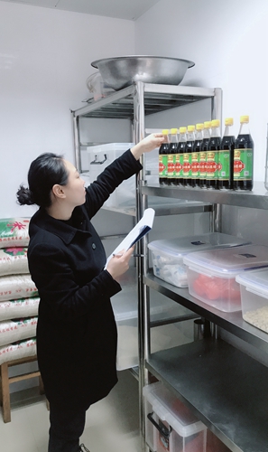 圖為工作人員檢查食堂用品 此外,工作人員每周將不定期對食堂內外環(huán)境、倉庫存儲擺放、操作間衛(wèi)生情況、餐飲具消毒清洗、從業(yè)人員采購登記、一日三餐留樣制度等進行檢查,并制定員工就餐登記要求,提前登記用餐人數,改變以往不就餐又不打招呼的現象,大大減少了不夠吃與浪費食材的現象。