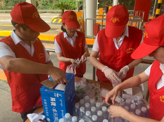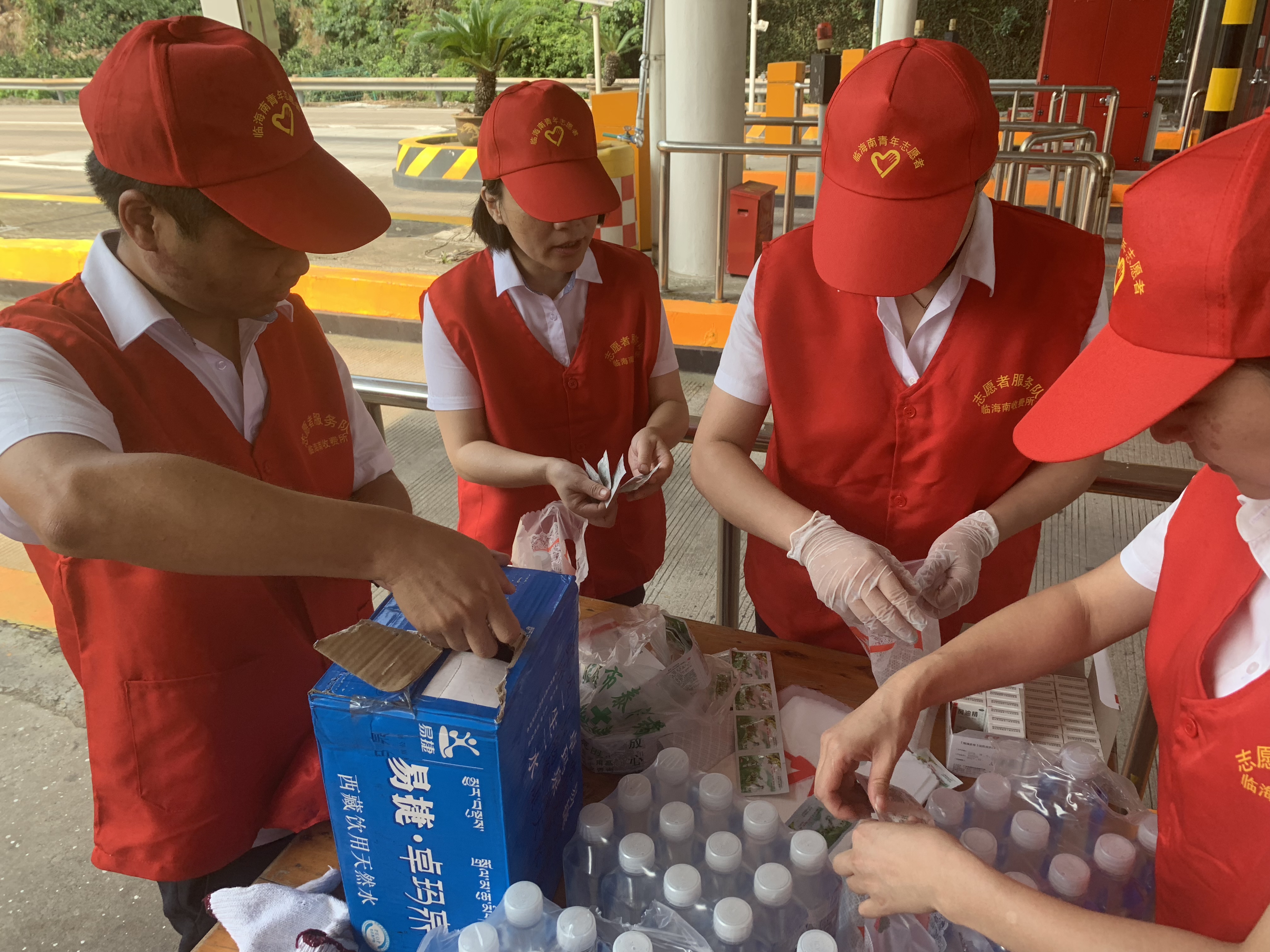 8月14中午,臨海南收費所車道安全島內搭起臨時愛心服務臺,準備禮品袋、礦泉水、風油精、人丹等物品,過往司乘人員免費提供解暑用品
