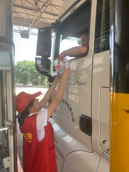 圖為志愿者向過往司乘人員遞上防暑用品