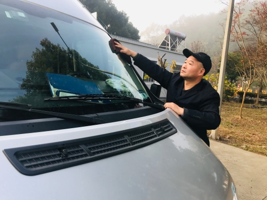 圖為楊堅(jiān)在擦洗車輛