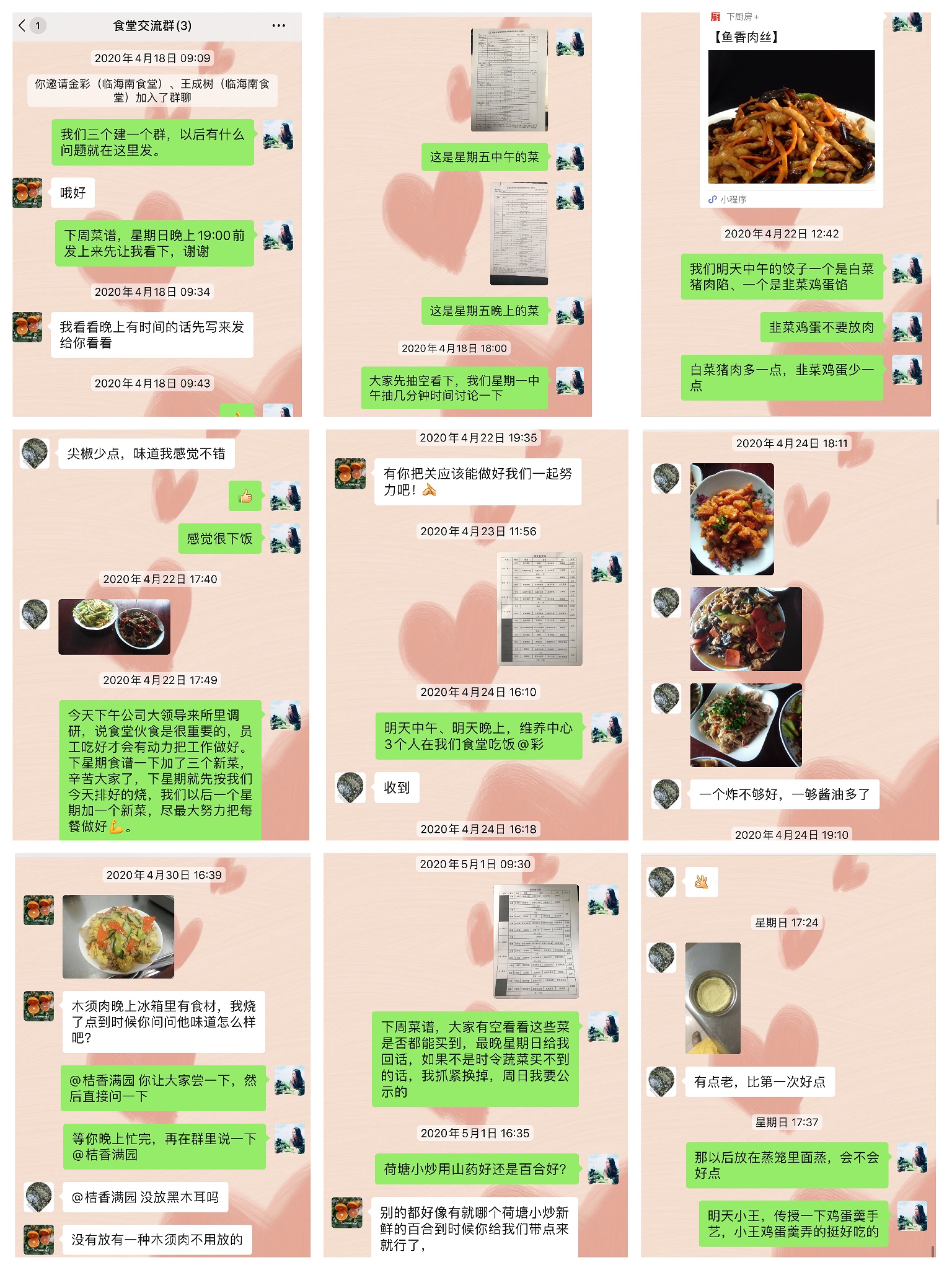 圖為建立食堂交流群 今年4月中旬,所務陳瑩利用微信建立了食堂交流群,經常在群里上傳從網上、廚房APP上下載的一些簡單又美味的家常菜制作方法。并結合食堂人員的特長,針對季節變換,合理調整飲食,做到葷素搭配、飯菜每班一日三餐不重樣等要求,提前列出每周菜譜,要求食堂人員根據菜譜,每周針對創新家常菜,提前準備少量食材,精心燒制,待嘗試滿意后再供應。