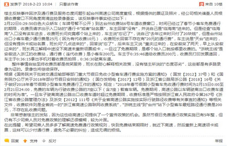 集團(tuán)對此事件高度重視,當(dāng)即調(diào)取當(dāng)時(shí)多路監(jiān)控錄像,還原了事件真相。2月22日凌晨0:29:50,投訴人駕駛小轎車進(jìn)入臺(tái)州所6號車道,時(shí)間已經(jīng)過了春節(jié)小客車免費(fèi)通行的期限,收費(fèi)員黃智超請求出示入口站的通行卡或者紙質(zhì)繳費(fèi)憑證,車主回答無卡無票,聲稱自己是從臨海南上進(jìn)入高速。經(jīng)查證,臨海南并沒有該車的入口信息。收費(fèi)班長再次詢問時(shí),車主說“忘記了”,說自己“去年過來時(shí)只付了20塊錢”,但是臺(tái)州站出口小客車最少通行費(fèi)是25元(因?yàn)橛写召M(fèi)10元),收費(fèi)班長回答不存在有“20元的通行費(fèi)”,司機(jī)忽而改口說是天臺(tái)進(jìn)入的,忽而想了一下又說是重慶過來的,在安徽呆了兩天,當(dāng)天早上從安徽上的高速。班長再三解釋中途沒下高速未重新領(lǐng)票或卡,一旦過了免費(fèi)期限,是哪個(gè)站入口就按哪里收費(fèi)的。“浙皖主線”是安徽進(jìn)入浙江的收費(fèi)站,通行費(fèi)(連代收費(fèi))是小客車200元。車主于0:35:46遞給收費(fèi)員200元,收費(fèi)員打印發(fā)票遞回,車主于0:36:15拿出手機(jī)對著收費(fèi)員拍照,0:36:30駛離車道。