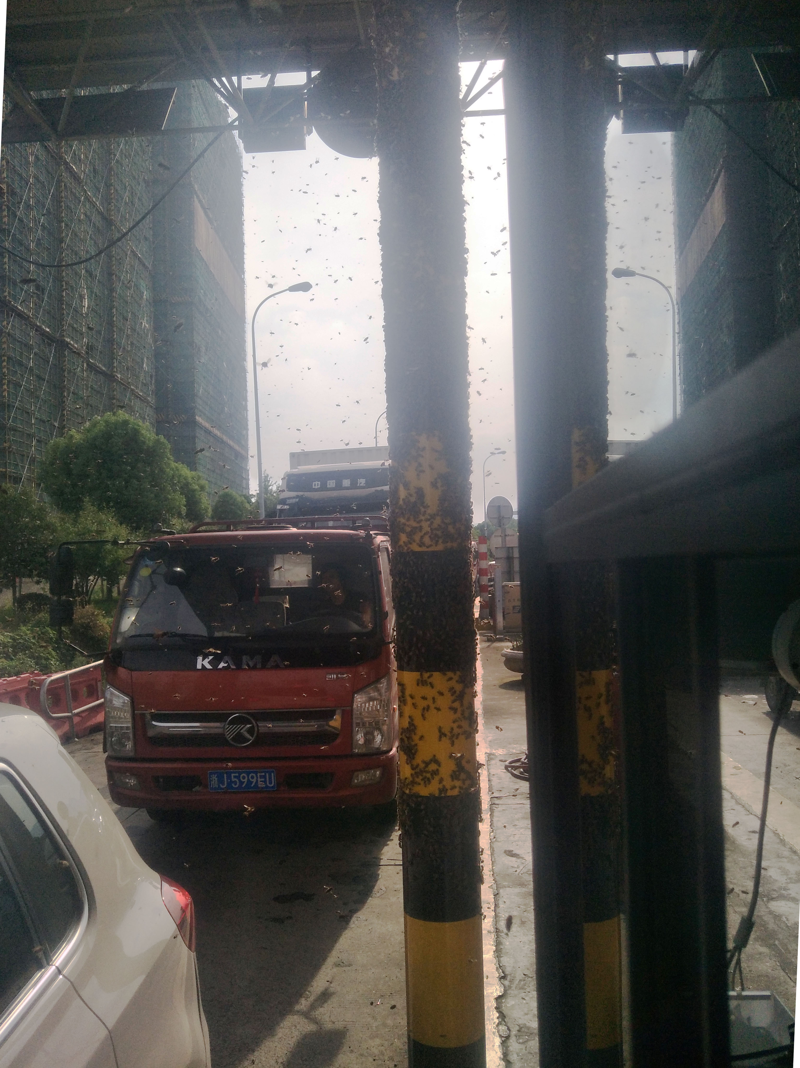 圖為蜜蜂集聚在收費站 原來這輛綠通車運輸蜂箱,由于蜂箱沒有關(guān)閉嚴(yán)實,在車通過車道檢查稍作停留時,大量的蜜蜂乘機(jī)逃出,圍攻收費崗?fù)ぃ炜账查g一片密密麻麻。它們有的停留在車道的防撞柱上,有的在收費窗口附近盤旋,遲遲不肯離開,嚇得過收費站等待繳費的司機(jī)不敢開車窗繳費。