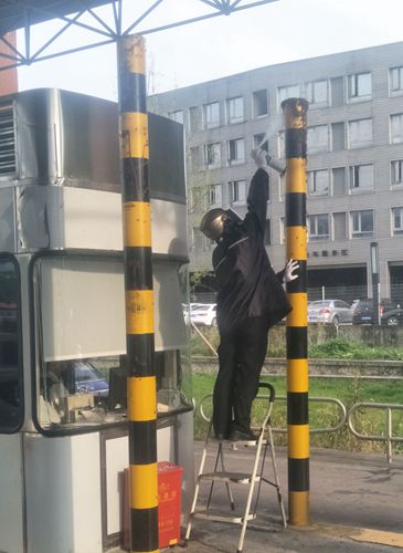 圖為工作人員用殺蟲劑噴射蜜蜂 當(dāng)班副班長何丹燕立即將車道內(nèi)情況報告給所領(lǐng)導(dǎo),副所長何先林聽聞后急急披上雨衣,戴上頭盔和手套,迅速趕到車道,經(jīng)過簡單防護(hù)的他用殺蟲劑噴射蜜蜂集聚的位置。與此同時,何丹燕疏導(dǎo)后方車輛從其他車道通行。