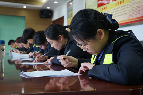 圖為筆試現(xiàn)場 比賽分筆試和現(xiàn)場問答兩部分,內(nèi)容涉及收費(fèi)政策、業(yè)務(wù)知識、特情處理、內(nèi)控管理制度。筆試試題分成6份,參考人員隨機(jī)選題,各班組分批閉卷測試,最后取班組平均分進(jìn)行排名。現(xiàn)場問答由必答題、搶答題、場外題等多個部分組成,采用累積計(jì)分、搶錯答錯扣分方式進(jìn)行。各組以班組為單位每班派出3名選手,分成四組,其他班組人員則參加場外搶答。 “開具高速公路電子發(fā)票可下載“票根”APP或登錄票根網(wǎng)的網(wǎng)址是?” “車道移動支付掃碼設(shè)備連接異常,導(dǎo)致無法支付,需要做哪些?”