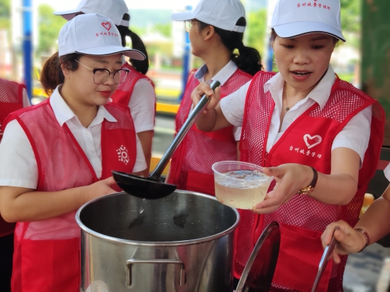 圖為志愿者合影 上午9點,志愿者們身著統(tǒng)一紅馬甲,在崗亭的安全島上設立服務臺,抬出食堂提前制作好的青草糊、綠豆湯等清涼飲品。你來分杯我來送,大家不亦樂乎開始了送清涼活動。