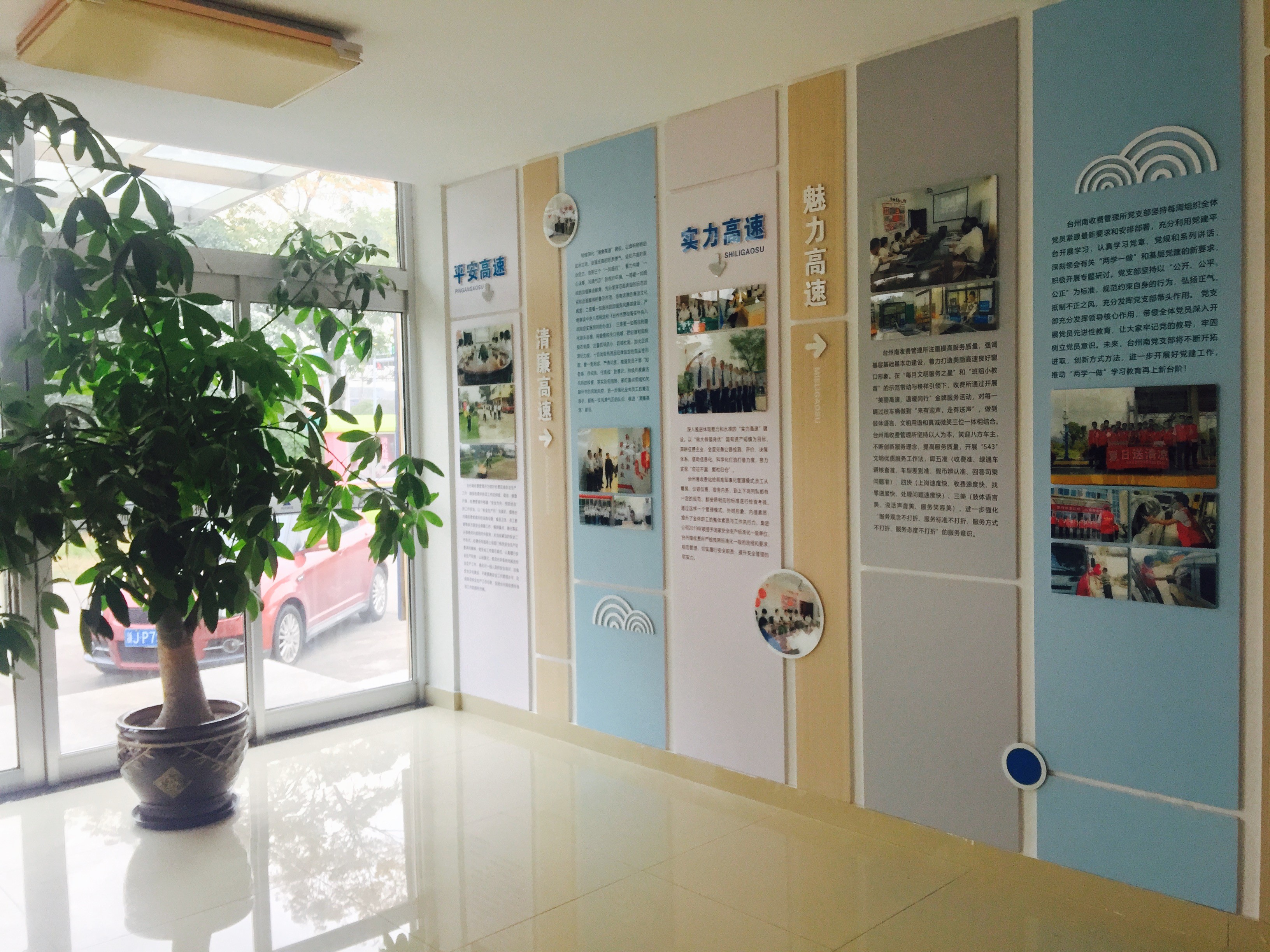 近日,臺州南收費所的門廳悄然換上了新裝,兩面設計新穎別致圖文并茂的介紹版取代了原先略顯陳舊的介紹版,成了踏進所內迎面而來的點睛之作。這“舊貌煥新顏”的背后,正是所內黨員自發組織積極參與的行動力。