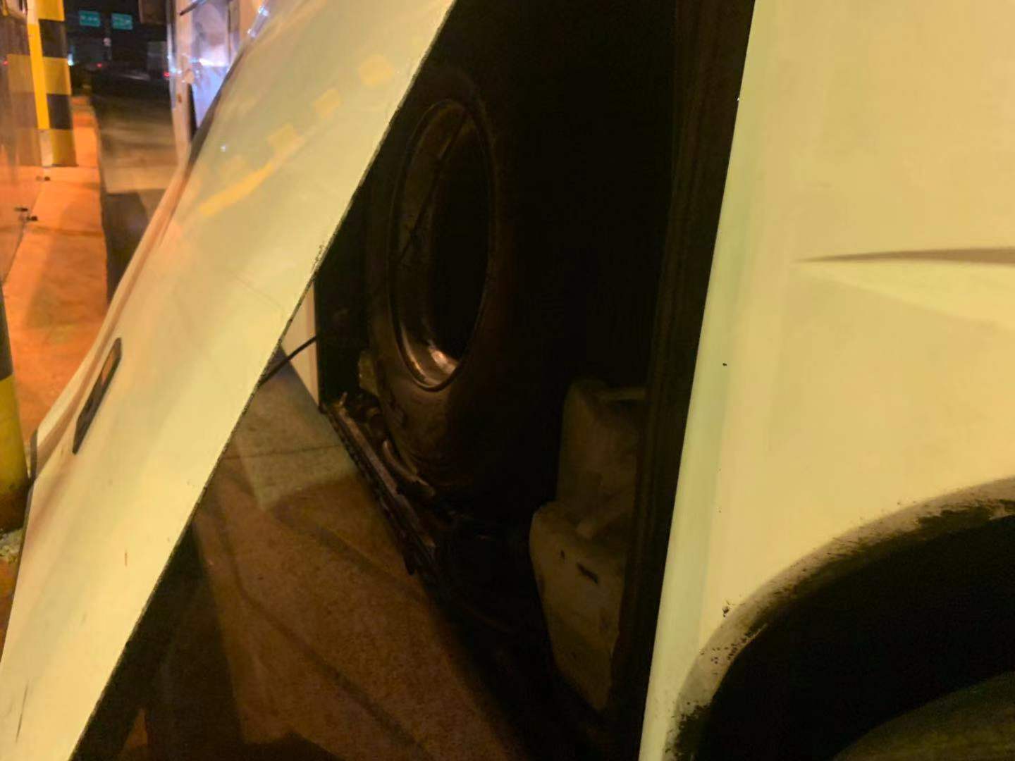 此次事故由于客車車箱內放置過多的物品,在車箱門邊上還硬塞了幾只大輪胎,最終導致輪胎將側門擠開而沒被司機發現,在高速過ETC車道時箱門撞到了設備,司機對此也是后悔不已。