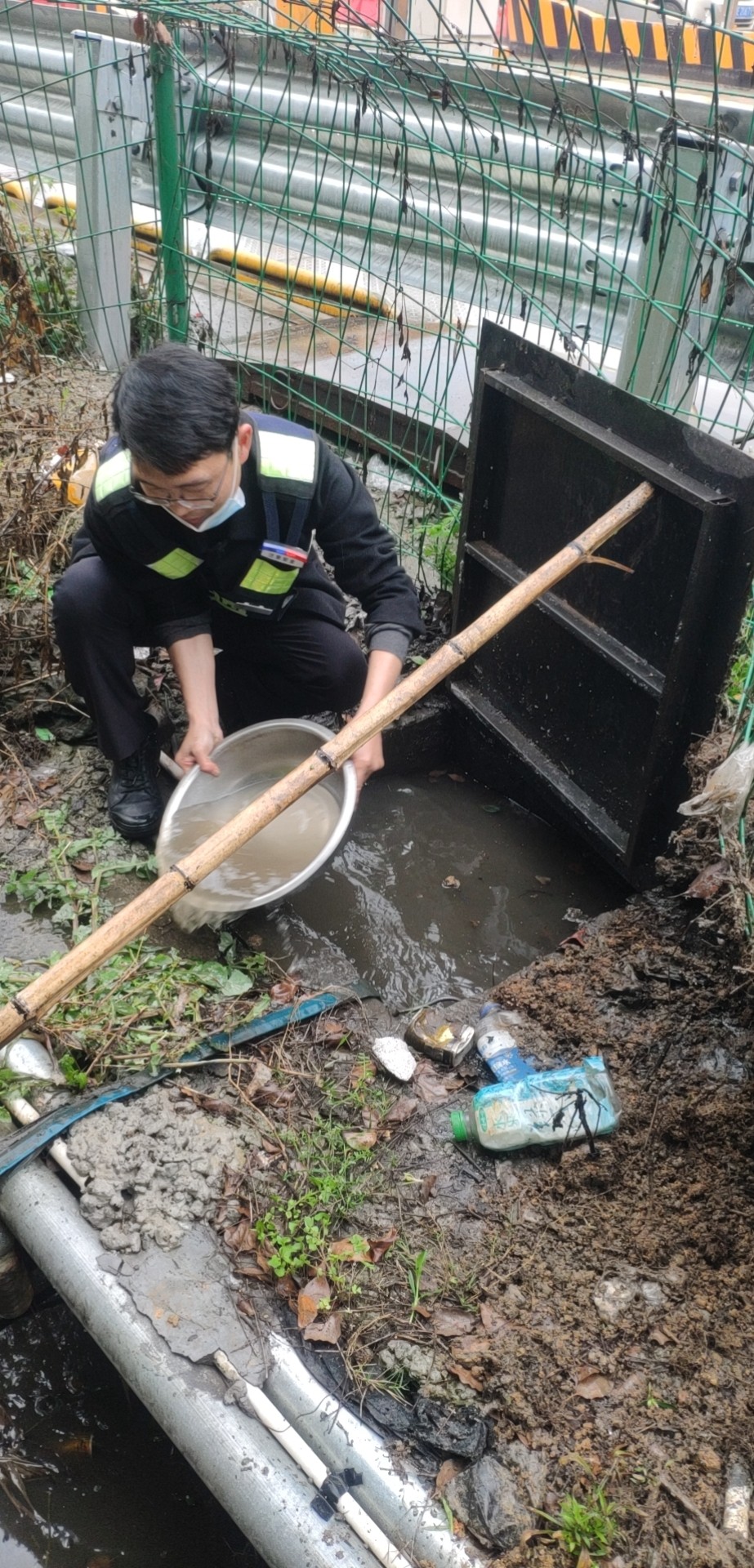 找出原因后,鄭星趕忙跑到所里取來一個水盆和一根木桿子。他用木桿支起排水坑上的蓋板,將坑里的積水一盆一盆地舀到旁邊的排水溝里。引導完車輛的林華平也過來協助鄭星。雖然此時外面下著雨,但他們全然沒顧上,只盼著舀水這個措施能夠有效,11號車道能夠早點恢復使用,進口秩序能夠早點恢復正常。