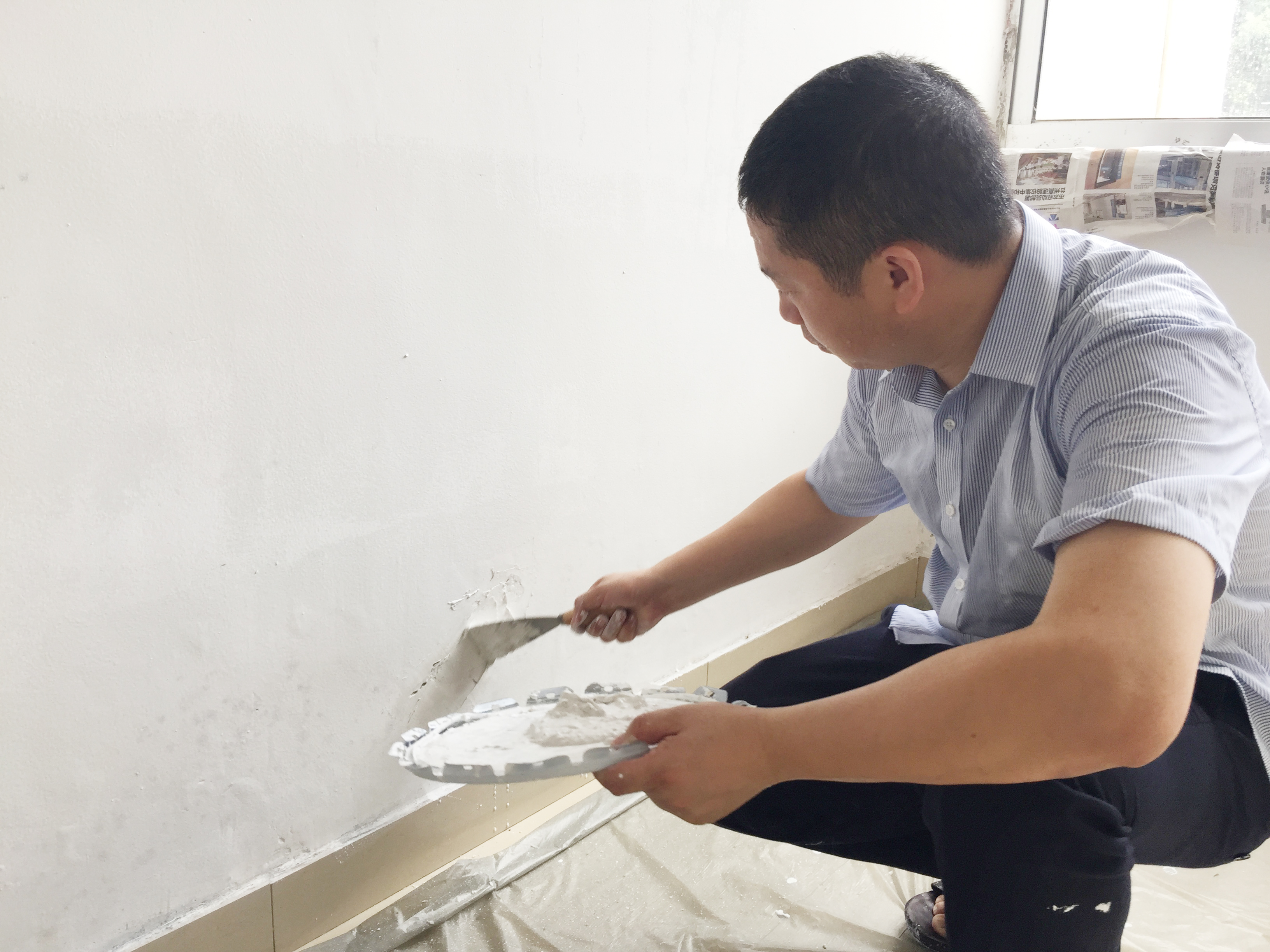 圖為“粉刷匠”粉刷現場 現場,工具備齊后,大家捋起袖子開始動工。家里正在裝修的林通,有著豐富的粉刷經驗,指導大家如何將墻體粉刷得平整又美觀。分工明確后,有的拿起粉刷棒,有的攪拌涂料,有的鋪墊報紙及塑料紙,有的清理刷墻后殘留在地面的垃圾。整個勞動過程中,各個動作麻利,干勁十足。粉刷是個技術活,更是個力氣活,只見浸滿涂料的刷子在墻上揮舞著,個個汗如雨下,卻都顧不得休息,在大家的齊心協力下,原本一片灰不溜湫的墻壁變得雪白光潔。 這次義務勞動,不僅美化了站所環境,營造出廉潔的工作氛圍,增強了員工的凝聚力和向心力,更增加了全體員工對公司的一份熱愛。 林玲