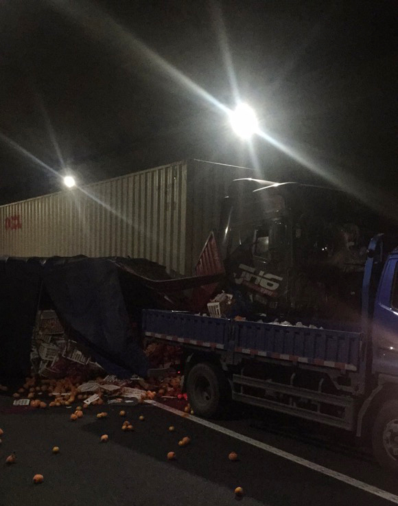 圖為事故現場 得知此情況,所負責人第一時間趕赴事故現場。事故就是命令!救援隊伍立即兵分三組,一組由駕駛員林通用巡邏車送傷者至臺州收費所出口,與前來救援的120救護車進行對接,一組由金志輝、宋勤滿在寧向南洞口卡口,一組由李海福所長、應錦清副所長在現場協調指揮,同時配合交警維護通行秩序,與交警一起對事故現場展開救援。 經了解,由于藍色貨車超車道緩慢行駛,集裝箱與貨車發生車輛剮蹭追尾導致后方送桔貨車側翻。貨車上的桔子多半散落,給清障帶來一定的難度,管理所負責人、高速交警、清障人員、養護人員共同當起了“指揮員”、“搬運工”,全力清理事故現場。 16時36分,由于處理及時,措施得當,事故未造成大面積擁堵,道路恢復正常通行。 林玲
