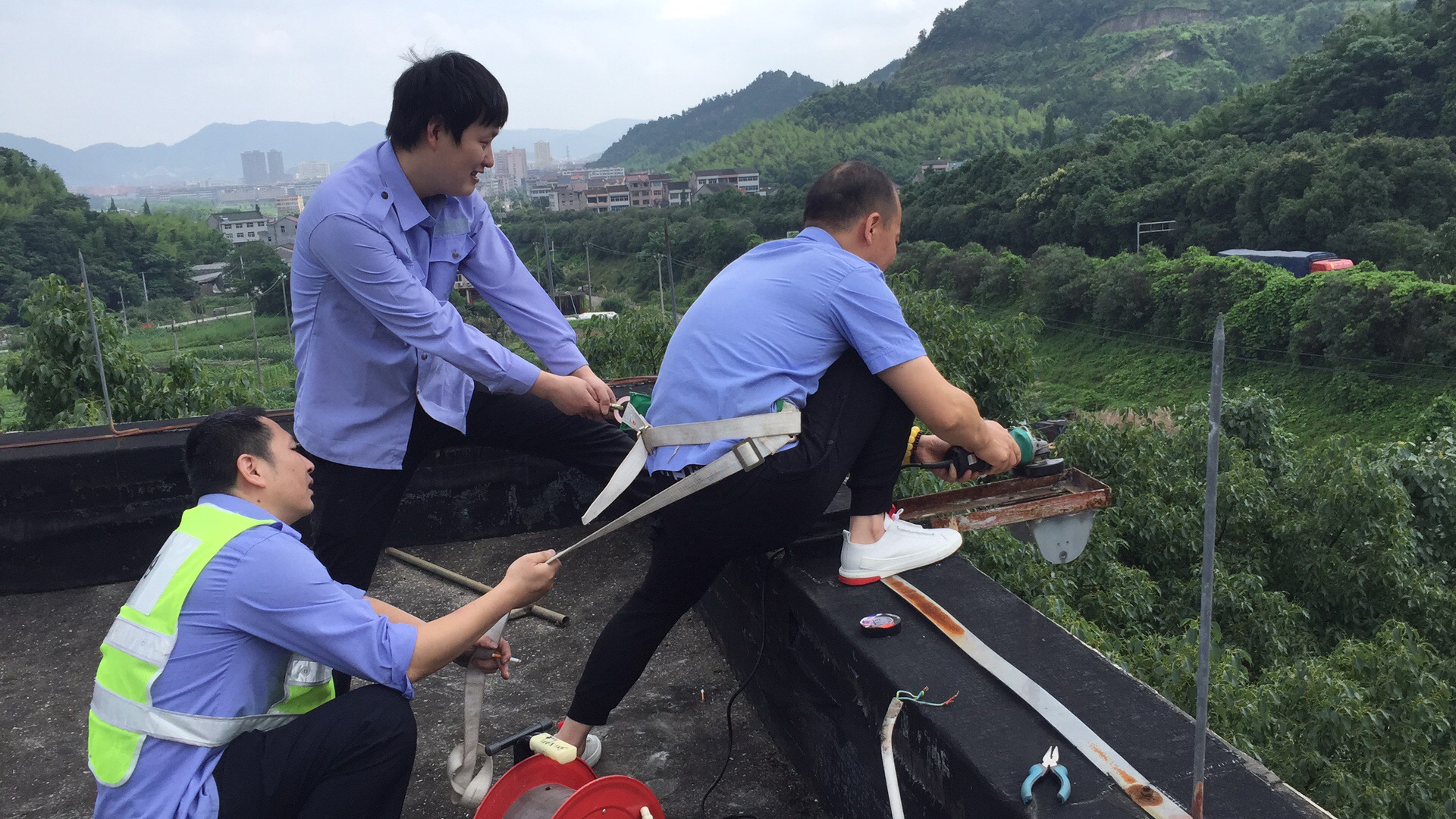 堅持優(yōu)良傳統(tǒng),執(zhí)勤隊員變廢為寶 6月24日上午,乘著難得的晴天,大溪嶺隧道所執(zhí)勤隊對管理房的標牌射燈進行更換。 由于射燈需設(shè)置在屋頂,隊員們需要爬到四樓屋頂。一到房頂,隊員們傻眼了,原來的高壓鈉燈經(jīng)過風吹日曬地早已銹跡斑駁,燈具無法拆卸。面對困難,黨員干部要沖在前,現(xiàn)在唯一的辦法是用切割機切割,因為高空作業(yè)的危險性,執(zhí)勤隊長站了出來,腰上綁著安全帶,站在屋頂邊緣作業(yè)。拉著安全繩的隊員們都為隊長捏了一把汗,幸好,同事們配合默契,幾個小時后順利完成LED射燈更換工作,新?lián)Q上的LED節(jié)能燈,不僅使命壽命長,而且又節(jié)能環(huán)保。