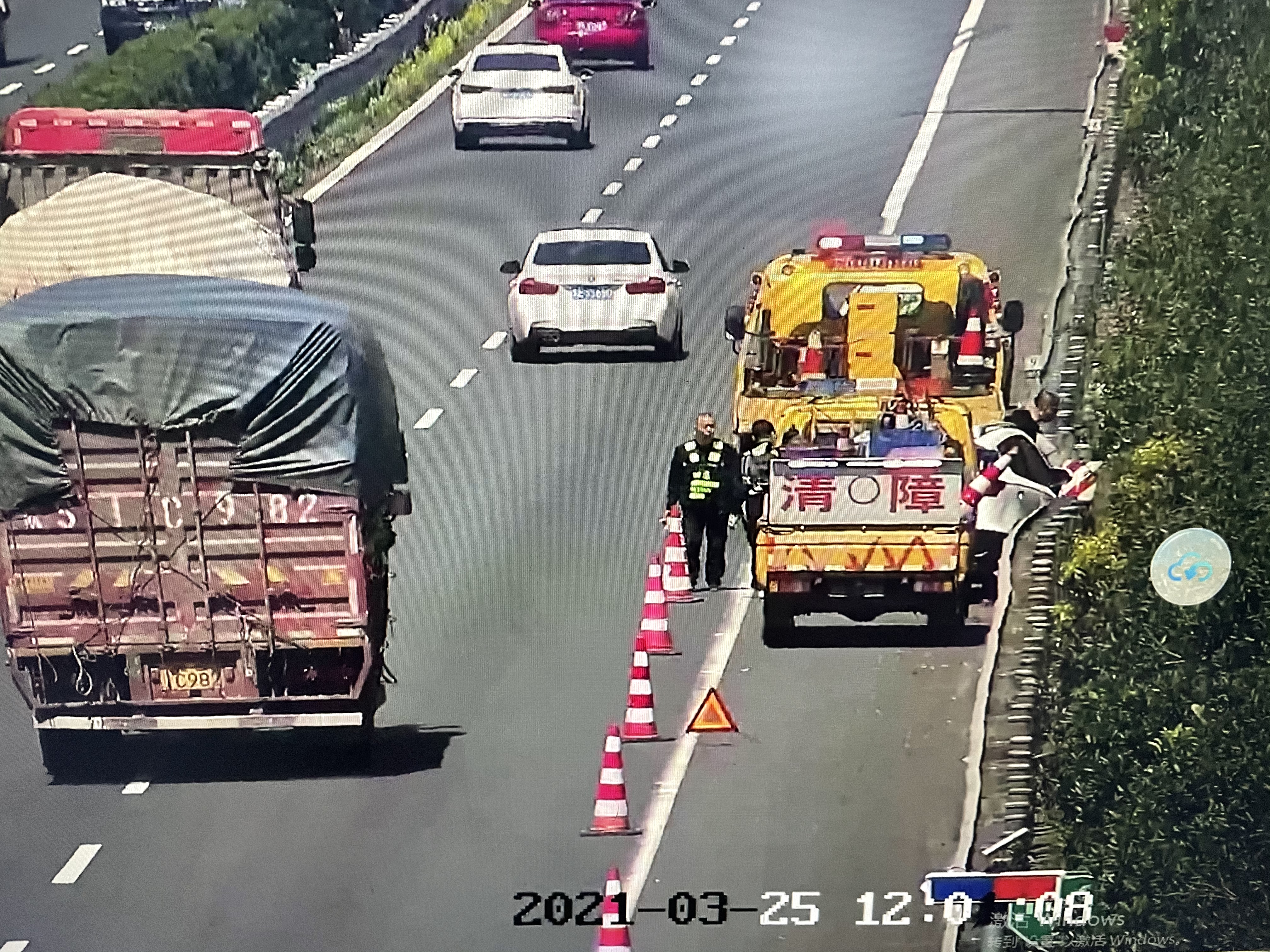 這是一起單車撞護欄的交通事故。拉近鏡頭后發現前面有兩輛車停著,是過路熱心的駕駛員在幫司機報警,并在后方擺放了三角警示牌。中控員再次與過路司機聯系詢問駕駛員情況,得知駕駛員因為多次碰撞而昏迷,便馬上通知120急救車趕往現場。