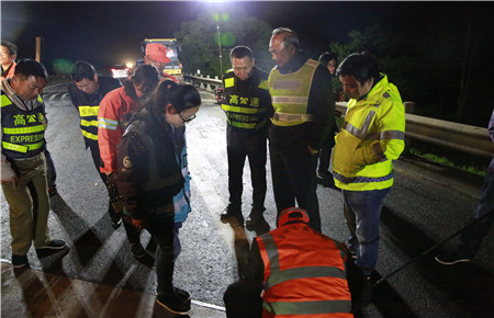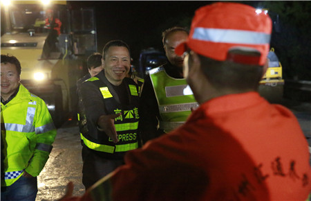 路面養(yǎng)護(hù)施工已經(jīng)第五天,當(dāng)晚計劃完成K1655+897-K1656+943之間860米的路段罩面,銑刨6個橋頭。工人們每天夜出晝伏,持續(xù)的徹夜工作,違反生理規(guī)律、勞動強(qiáng)度較大,體力精神上都比較辛苦。盡管張建平在此期間一直參加黨校學(xué)習(xí),但還是百忙之中特地抽時間到施工現(xiàn)場為工作人員加油打氣。