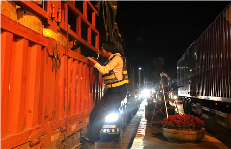 夜間綠農(nóng)車輛多,據(jù)統(tǒng)計(jì),當(dāng)天凌晨早班臨海南收費(fèi)所出口綠農(nóng)車108輛,是平時(shí)日均數(shù)量的八九倍。短時(shí)間內(nèi)的“井噴式”增長(zhǎng),這又是一個(gè)大考驗(yàn)。“三號(hào)綠色”、“一號(hào)綠色”、“二號(hào)綠色”……“來(lái)啦!”旁站人員箭步?jīng)_過(guò)去拍照取證、檢查車輛。大貨車又高又寬,平時(shí)需登專用扶梯進(jìn)行檢查,可在大流量面前保安全省時(shí)間是第一要旨,這些個(gè)巾幗女將們面對(duì)高貨車,一手拉著車把,一腳踩在車杠上,迅速上車開(kāi)展核查,執(zhí)行速度絲毫不遜于男同志。有時(shí)剛從這輛貨車上下來(lái),又立刻奔向了其它車道。晴夜當(dāng)空,車道間一個(gè)個(gè)忙碌的身影不停穿梭著,卻不言乏力。