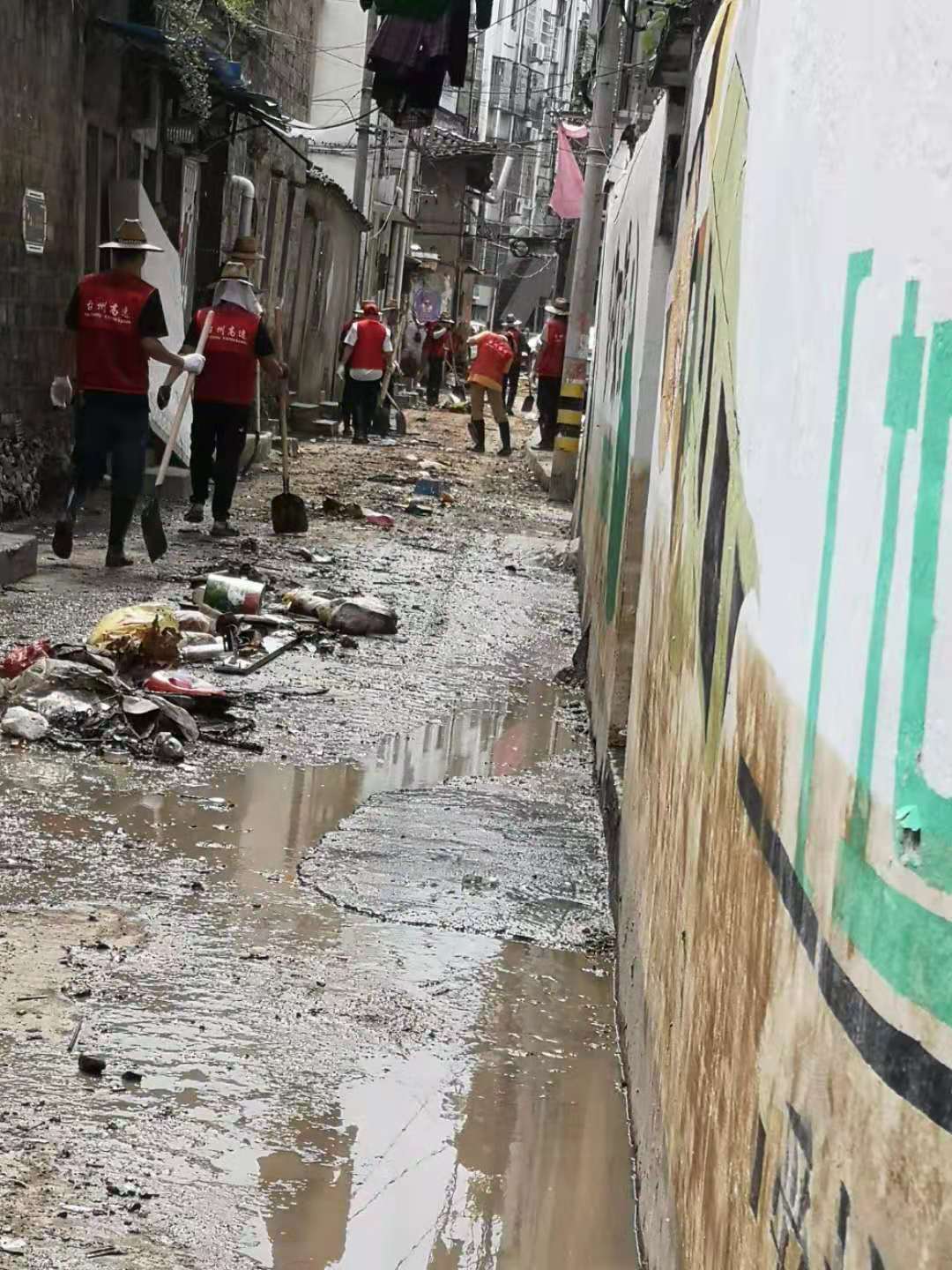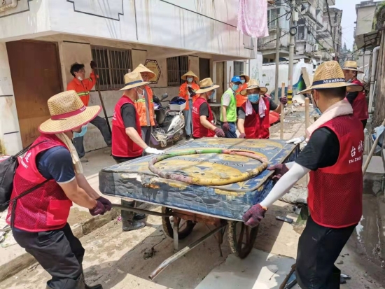 圖為臺州高速志愿者支援災區重建現場 在臨海古城赤城路米篩巷,臺州高速集團的志愿者們頂著毒辣的太陽,不怕臟不怕累,積極為災后重建貢獻力量,清理路面淤泥、垃圾,保障路面清潔以及道路順暢。 真情傳遞溫暖 愛心匯聚力量, 面對災后重建, 臺州高速集團用實際行動, 彰顯鐵軍精神, 承擔社會責任, 展現使命擔當。