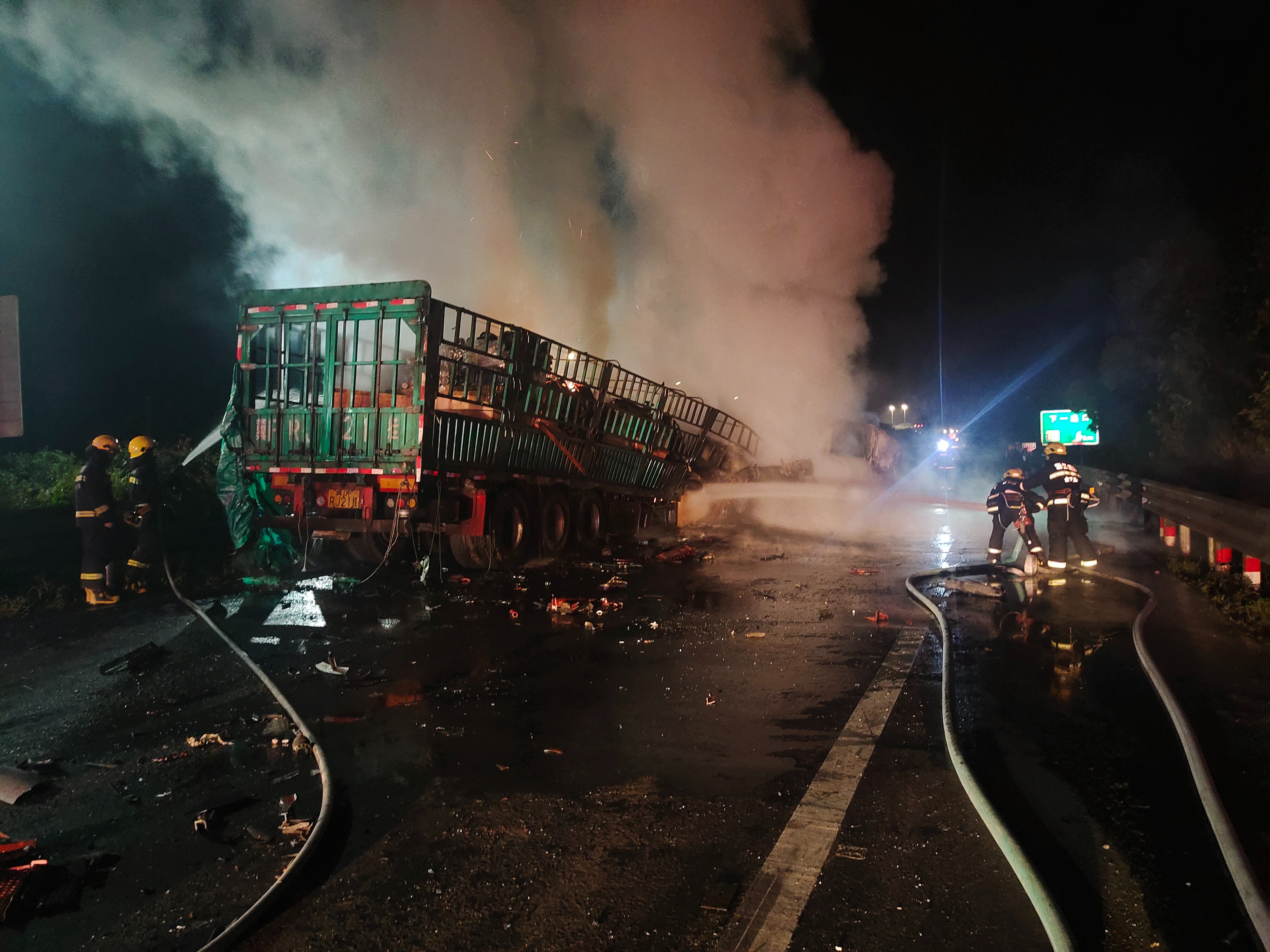 4月21日凌晨2點(diǎn),G15沈海高速甬臺(tái)溫段寧波方向距離黃土嶺隧道不到2公里的地方,有一輛半掛車與前車發(fā)生追尾事故,隨后起火燃燒。