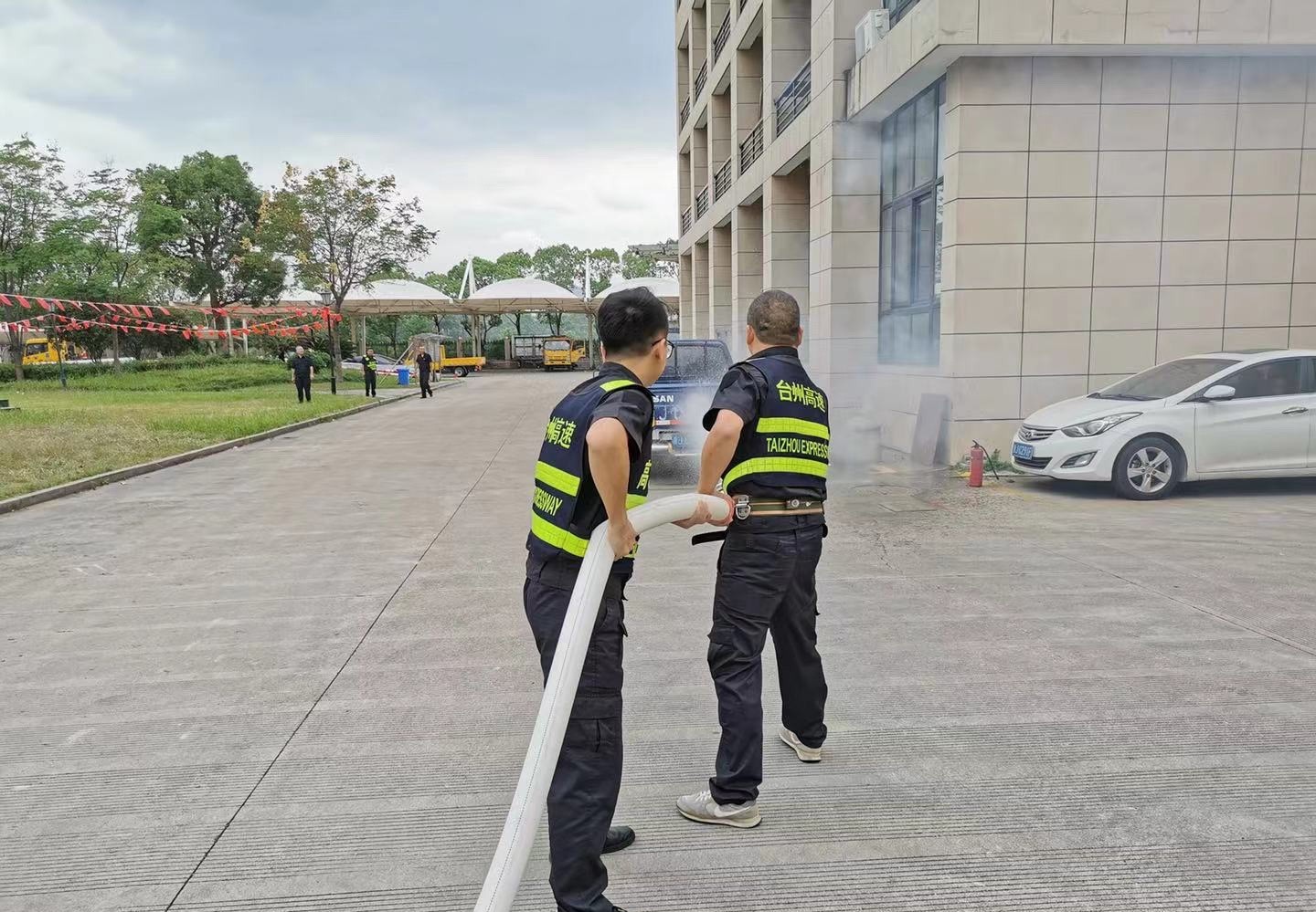 2021年6月18日上午,施救中心全體員工在臺州所收費廣場進行了一次應急消防演練培訓。