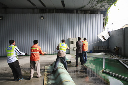 圖為工人在合力拆除違建物 現(xiàn)場經(jīng)過兩個多小時切割作業(yè),成功完成拆除。