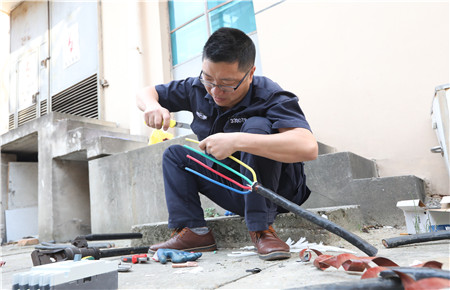 臺(tái)州收費(fèi)所倉庫前方的空地,電工操作的選手們一字排開,他們熟練地用電工刀,在電纜上輕輕一劃一轉(zhuǎn),整個(gè)絕緣外殼立馬脫離,緊接著去鉛皮、掰角度、壓接頭,不到10分鐘,一根三相四線電纜接頭就此制作完成了。