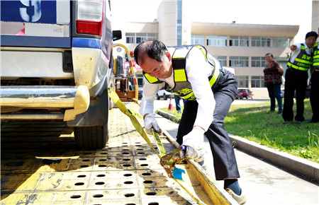 當(dāng)哨聲響起時(shí),清障作業(yè)的考試開始了。就象聽到路上事故的指令,選手們飛快躍上清障車,趕到“現(xiàn)場”,一組兩名員工,一名快速擺放隔離筒進(jìn)行預(yù)警,一名趕到“事故車”前進(jìn)行背拖拖曳作業(yè),綁帶作業(yè)、固定輪胎,甚至警燈、檔位、手剎、安全帶、巡視事故車等細(xì)節(jié)也有具體要求,雖然上午天氣涼爽,可因?yàn)楸荣惖乃俣缺绕磁c現(xiàn)場緊張的氣氛,選手們額頭都冒出了熱氣。