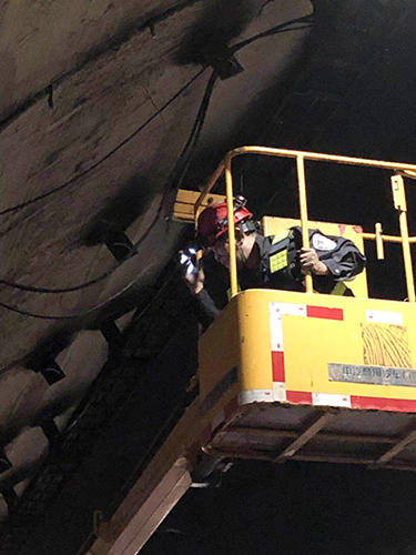 圖為各方人員集聚商討搶修方案 黃土嶺隧道所立即啟動應(yīng)急搶修預(yù)案,聯(lián)合高速交警、工程養(yǎng)護(hù)部、施救中心展開緊急搶修工作。現(xiàn)場,各方人員集聚商討搶修方案、檢查安全措施、布置搶修作業(yè)。登高車上,黃土嶺隧道所執(zhí)勤二隊隊長林朝波等一批搶修人員率先清理斷落的電纜,調(diào)整接線、緊固螺栓……各項工作環(huán)環(huán)緊扣,緊張而有序。