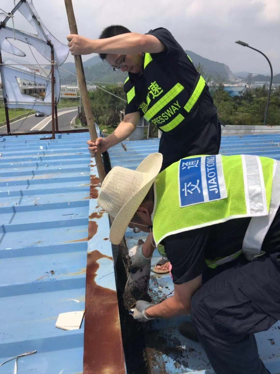為切實做好今年第9號臺風“利奇馬”各項防御工作,確保臺風期間轄區高速公路安全暢通,工程部機電設備維養中心提前對集團所轄路面及收費站機電設備進行了全面部署,消除安全隱患,全力防范強臺風。 全面清除收費頂棚及下水管道垃圾。集團沿線收費頂棚經過幾次的施工裝修,遺留了一些裝飾垃圾,如不及時清理一旦掉入排水溝或下水管道,勢必會造成頂棚漏水,影響下面人員及設備安全。8月7日,維養中心組織班員在登高車協助下,頂著炎炎烈日,利用垃圾夾、鐵鍬等工具對沿線收費站收費頂棚上方垃圾、排水溝中的淤泥進行了逐一清理,并重新鋪設排水溝上面的防護網,防止臺風期間吹來的一些塑料紙袋等輕型垃圾再次堵塞下水道。