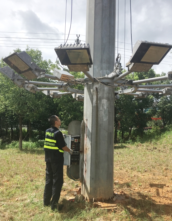 圖為工作人員下降各收費所互通區高桿燈 增強機電設備防水措施。集團收費站有很多機電設備直接安裝在戶外,因外層有開關柜保護,一般雨水是無法滲透的。可一旦遇上臺風雨等惡劣天氣就很難確保內部設備不會被打濕,尤其是計量柜里面的計重設備,一旦短路損壞會立即造成車輛擁堵。因此,剛完成高桿燈下降工作的中心隊員顧不上休息,又馬不停蹄趕赴收費所將計量柜、欄桿機等重要設備用封帶紙進行密封處理,不漏過任何一處可能進水的地方,大大增強了這些設備防水性能。