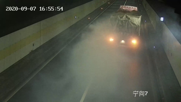 9月7日下午16點53分,一輛大貨車駛入寧向黃土嶺隧道,打著雙閃燈,整車發散出濃濃的煙霧,造成隧道內能見度極低。