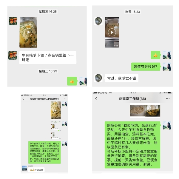 臨海南收費所不只是單單把宣傳標語掛在墻上,擺在桌上。更把節約舉措落實到具體行動中。為了不浪費食材,行政人員提前安排一周菜單,并統計用餐人數,規劃食材數量,食堂工作人員按照人數采購當天食材控制成本,并將每餐燒好的菜拍成視頻上傳食堂交流群,以更好地關注食堂動態,從源頭把控菜量與伙食的品質,每周還不定期抽查食堂,查看剩余量。 今后,臨海南收費所將持續加大宣傳力度,動真格、實打實,堅決遏制“舌尖上的浪費”,全體員工從現在做起,從點滴細節做起,做制止餐飲浪費、培養節約習慣的踐行者、推動者和宣傳者,使文明健康的生活方式、節儉消費的文明習慣深入人心。 陳瑩