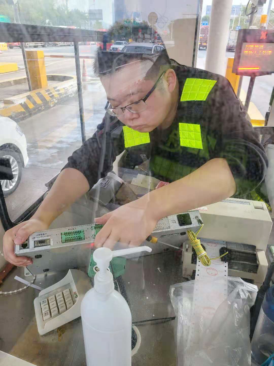 “咦,崗亭桌上的這個扁長形設備哪里去了,忽然感覺桌面整潔了好多!”剛來交班的臺州收費所收費員李靜一臉疑惑,“拿掉了這個設備,ETC車輛還能正常通行嗎?” “不是拿掉了,是我們給它般了個‘新家’而已。”工程部機電設備維養中心陳華棟指了指安裝在桌面下方的設備。