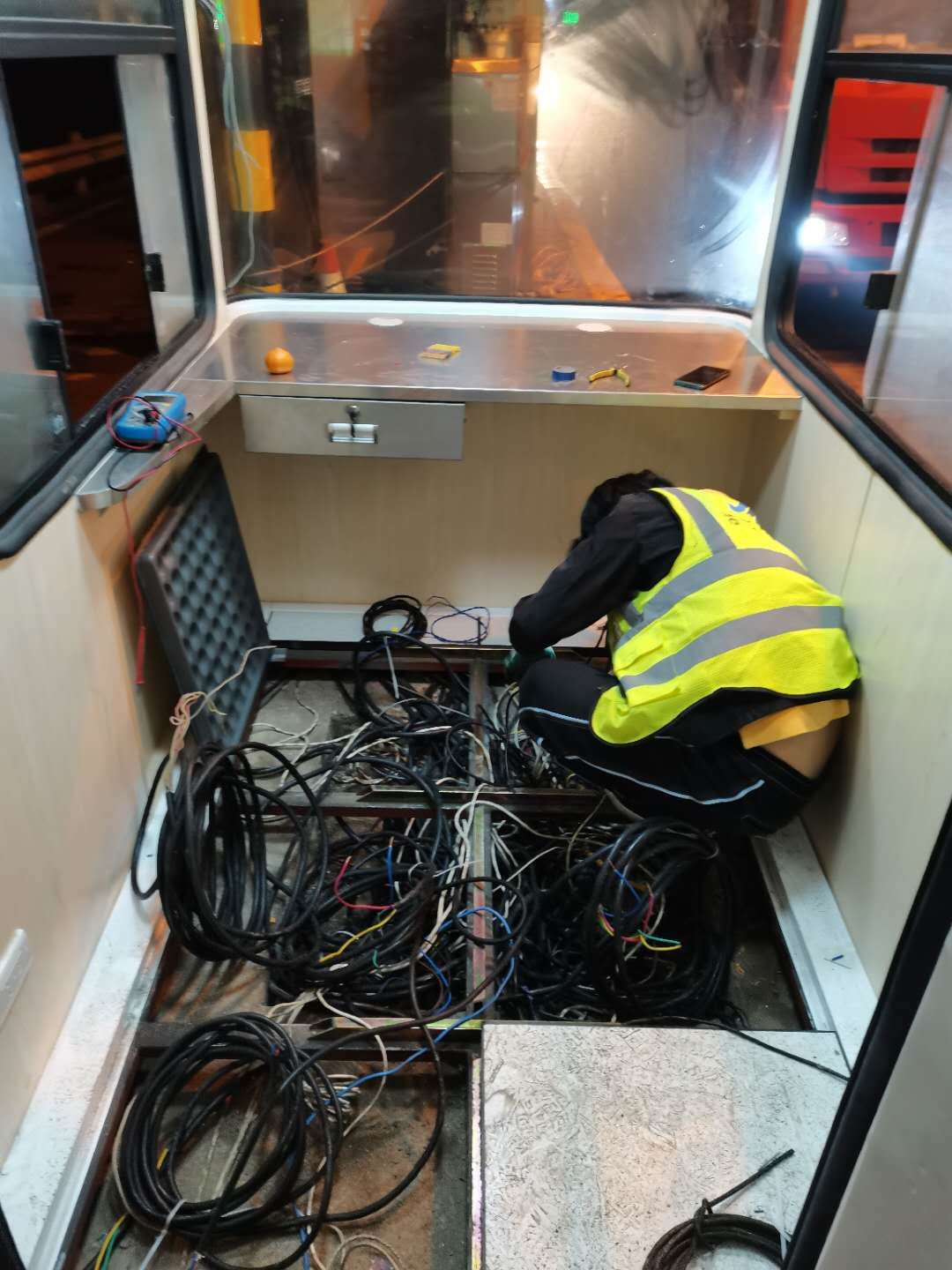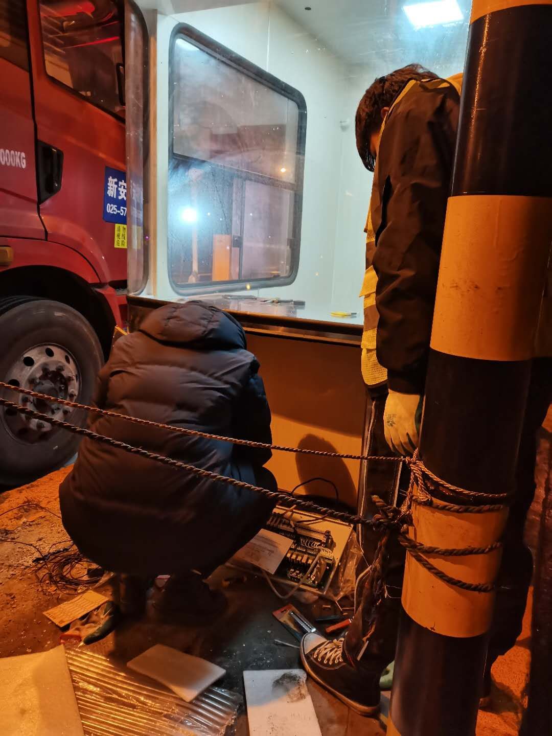 21日下午4點左右,訂購的新崗?fù)ず蛽p壞的設(shè)備設(shè)施陸續(xù)到位,中心值班人員協(xié)同設(shè)備廠家一起將其安放并固定至車道原位置。因崗?fù)A倒時拉斷了底下很多線纜,在拆除設(shè)備時又因為緊急搶修需要沒有作相應(yīng)標注,現(xiàn)場各種電線接頭雜亂如麻。考慮到夜間查線、接線存在一定的安全隱患,也不利于施工,搶修人員決定第二天再戰(zhàn)。