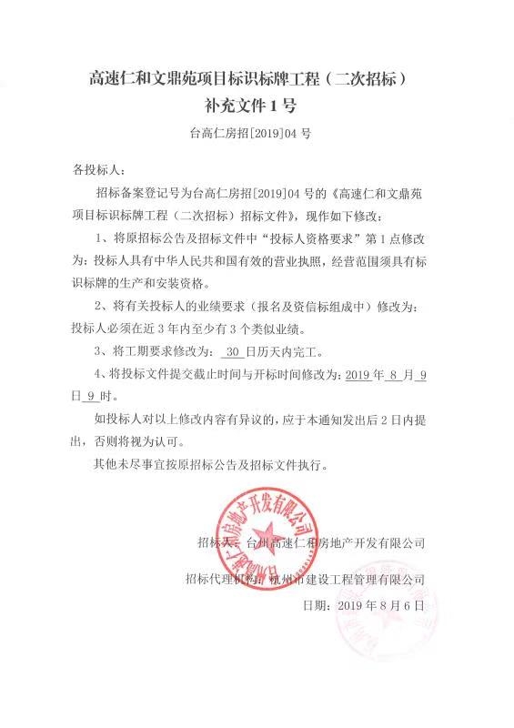 高速仁和文鼎苑項目標(biāo)識標(biāo)牌工程(二次招標(biāo))補充文件1號