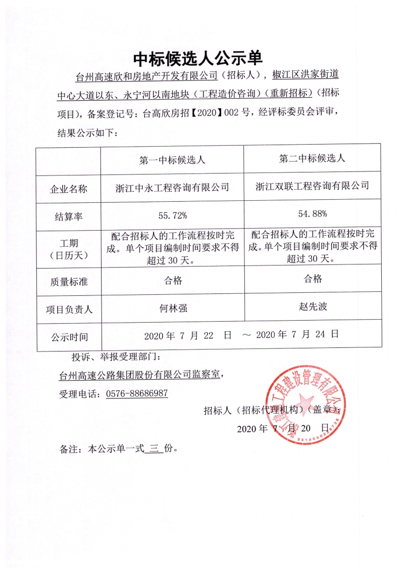 椒江區洪家街道中心大道以東、永寧河以南地塊(工程造價咨詢)中標候選人公示單