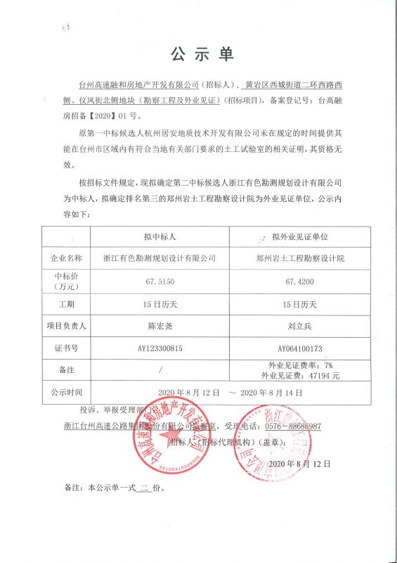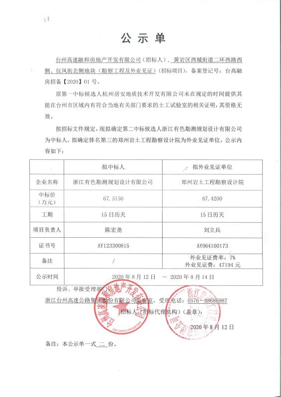黃巖二環(huán)西路西側、儀風街北側地塊(勘察工程及外業(yè)見證)中標公示