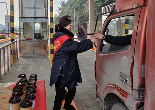 活動當(dāng)天,雖然氣溫較低,但是在臨海南收費(fèi)所入口處,身著紅色綬帶的志愿者們依然熱情地為過往司乘人員遞上一杯杯滾燙的姜茶,并向過往大貨車駕駛員發(fā)放優(yōu)惠政策宣傳單。