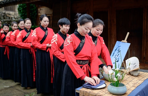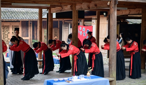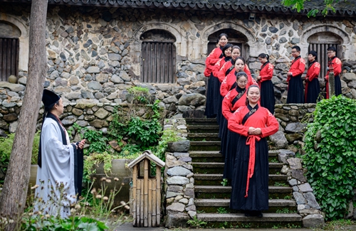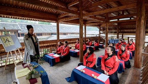 課堂正式開始前進行了一場隆重的“開學(xué)儀式”。 據(jù)《禮記》記載:“禮義之始,在于正容體,齊顏色,順辭令。”因此,第一課即是“正衣冠”。同學(xué)們換上漢服,一一站立,由先生依次檢查,然后“衣冠整齊”地排著隊集合。之后按照先生的要求,將手放到水盆中“凈手”,寓意凈手靜心,去雜存精,希望能在日后的學(xué)習中專心致志、心無旁騖。步入學(xué)堂后,舉行拜師禮,同學(xué)們向至圣先師孔子三叩首、進獻“釋菜禮”,寓意尊師重道、勤奮好學(xué)。